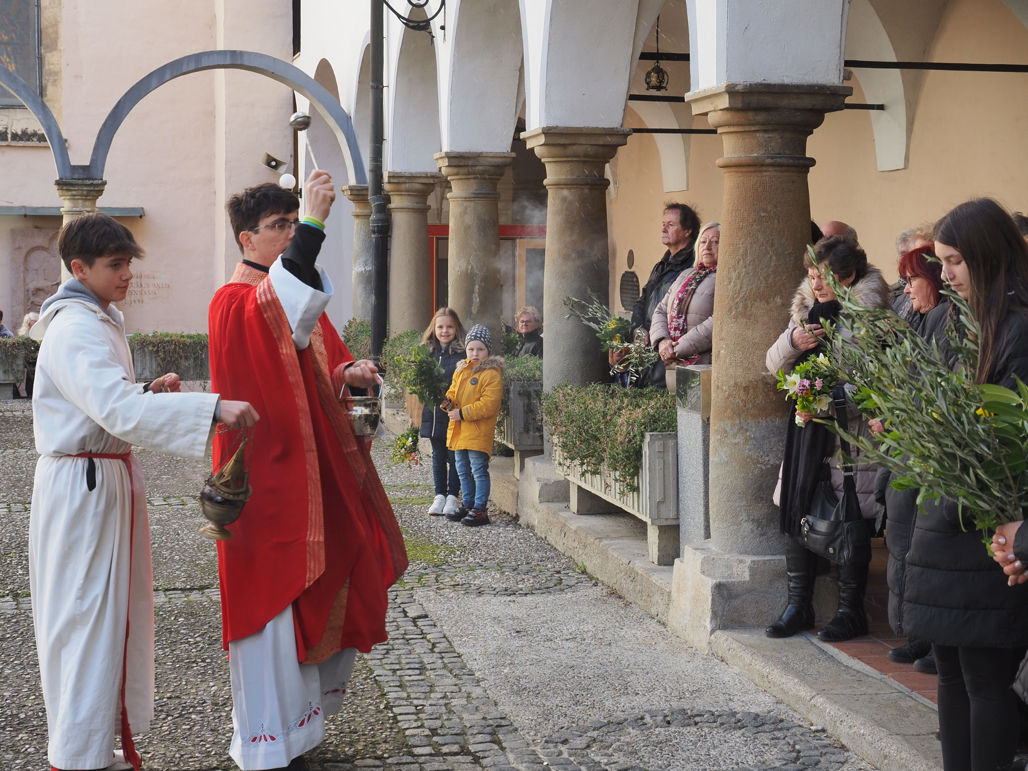 V naši župniji smo ta dan po 9.00 maši na dvorišču križnega hodnika blagoslovili zelenje, presmece in oljčne veje, ki so znamenje mladosti, znamenje življenja, znamenje veselja, ki so ga Jeruzalemski prebivalci pripravili Jezusu, ko se je na hrbtu oslička vzpenjal na Jeruzalemski grič.
