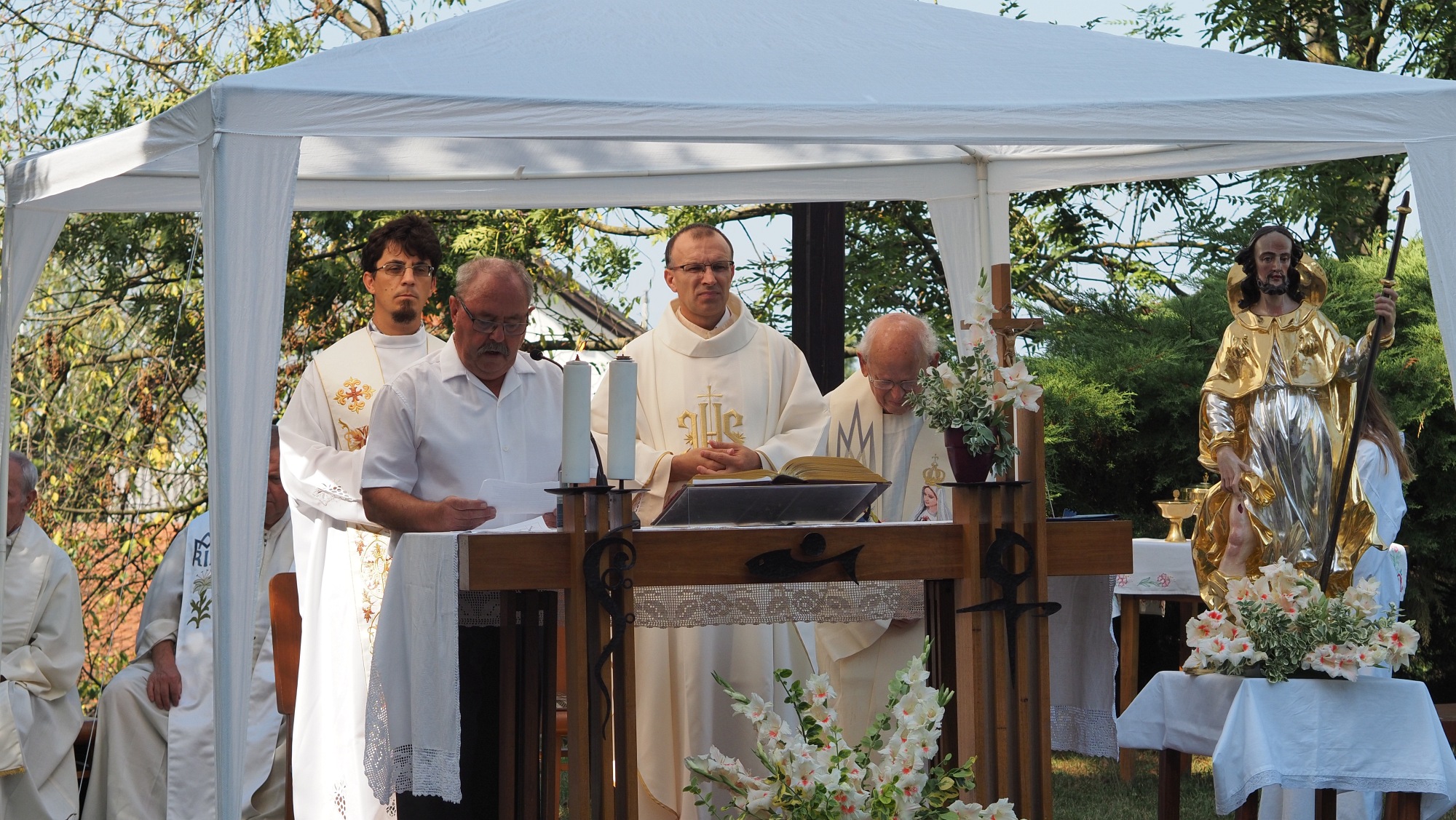 Priprave so trajale več dni, samo praznovanje pa smo pričeli v nedeljo, 18.8.2024 ob 10.00 uri s sveto mašo, ki jo je v somaševanju sobratov, vodil p. Matej Sentes, župnik sodelavec na Ptuju. V pozdravu pred mašo je vse navzoče v imenu skupnosti vernikov, ki se zbirajo pri sv. Roku pozdravil g. Janez Rožmarin in voščil p. Mateju, ob 20. obletnici mašniškega posvečenja. Pri sveti maši nas je nagovoril p. Matej. Sodelovali so domači ministranti in bralci, prepeval Mešani župnijski pevski zbor sv. Petra in Pavla pod taktirko g. Uroša Sagadina.