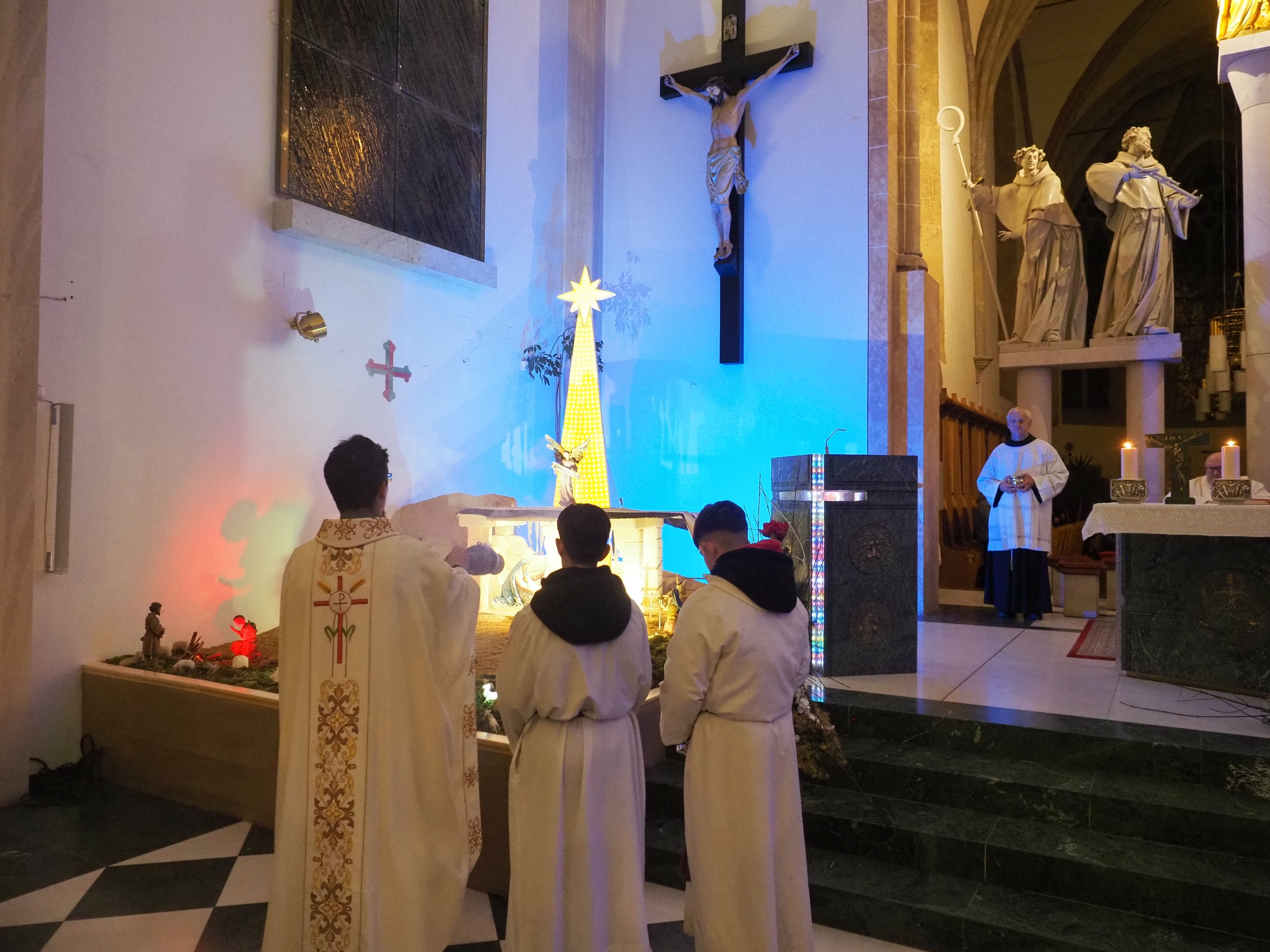 Na sveti večer, 24.12. smo ob 21.00 uri v cerkvi svetih Petra in Pavla obhajali božično mašo Jezusovega rojstva, namenjeno predvsem družinam z majhnimi otroki. Na koru je prepeval otroški zbor naše glasbene šole sv.Petra in Pavla, ki deluje v samostanu. Med mašo smo ob Božji besedi, predvsem evangeljskem odlomku, ki nam je spregovoril kako je bilo z rojstvom Jezusa, razmišljali o liku svetega Jožefa, Jezusovega rejnika in očeta po postavi, ki ga Sveto pismo imenuje pravičnega, kar "v jeziku" Svetega pisma poleg zvestobe Bogu in poštenosti v odnosu do ljudi označuje tudi usmiljenje, prizanesljivost in dobroto.
