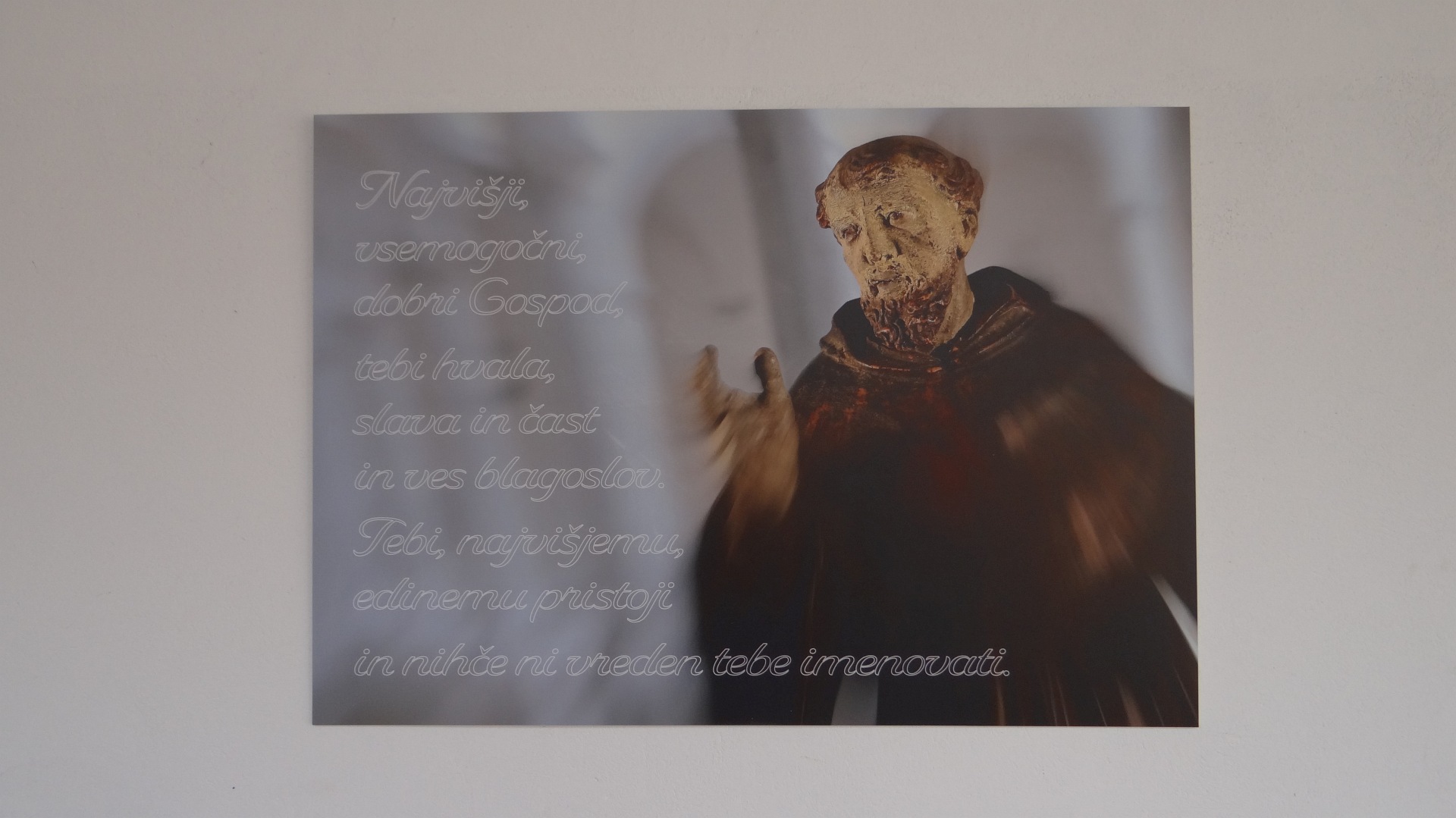 Čeprav želimo, da razstava nagovori vsakega na njegov lastni način, pa je na uvodni fotografiji besedilo p. Danila Holca, ki naj bi bilo neke vrste namig na Frančiškovo duhovno ozadje ob ustvarjanju te ne le pomembne italijanske pesnitve temveč tudi molitve.