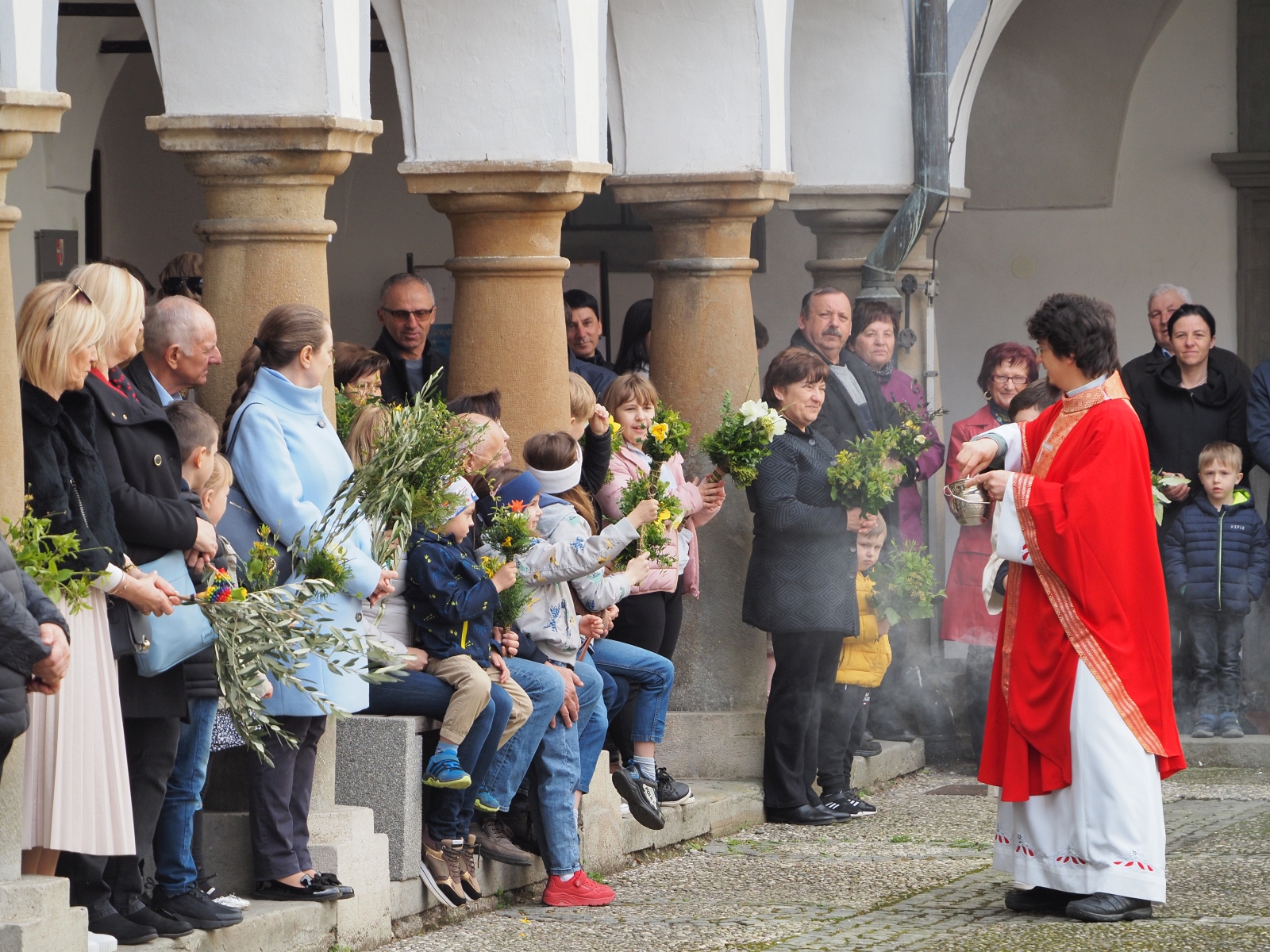 Na cvetno nedeljo se v Cerkvi spominjamo Jezusovega slovesnega vstopa v mesto Jeruzalem in z branjem pasijona pri sv. maši vstopamo v veliki teden našega odrešenja. V kloštru smo se zbrali pri maši ob 9.00, prisluhnili božji besedi in pasijonu, ki so ga poleg duhovnika (v vlogi Jezusa) brali člani skupine bralcev. Pri maši so prepevali pevci župnijskega zbora pod taktirko g.Uroša.
