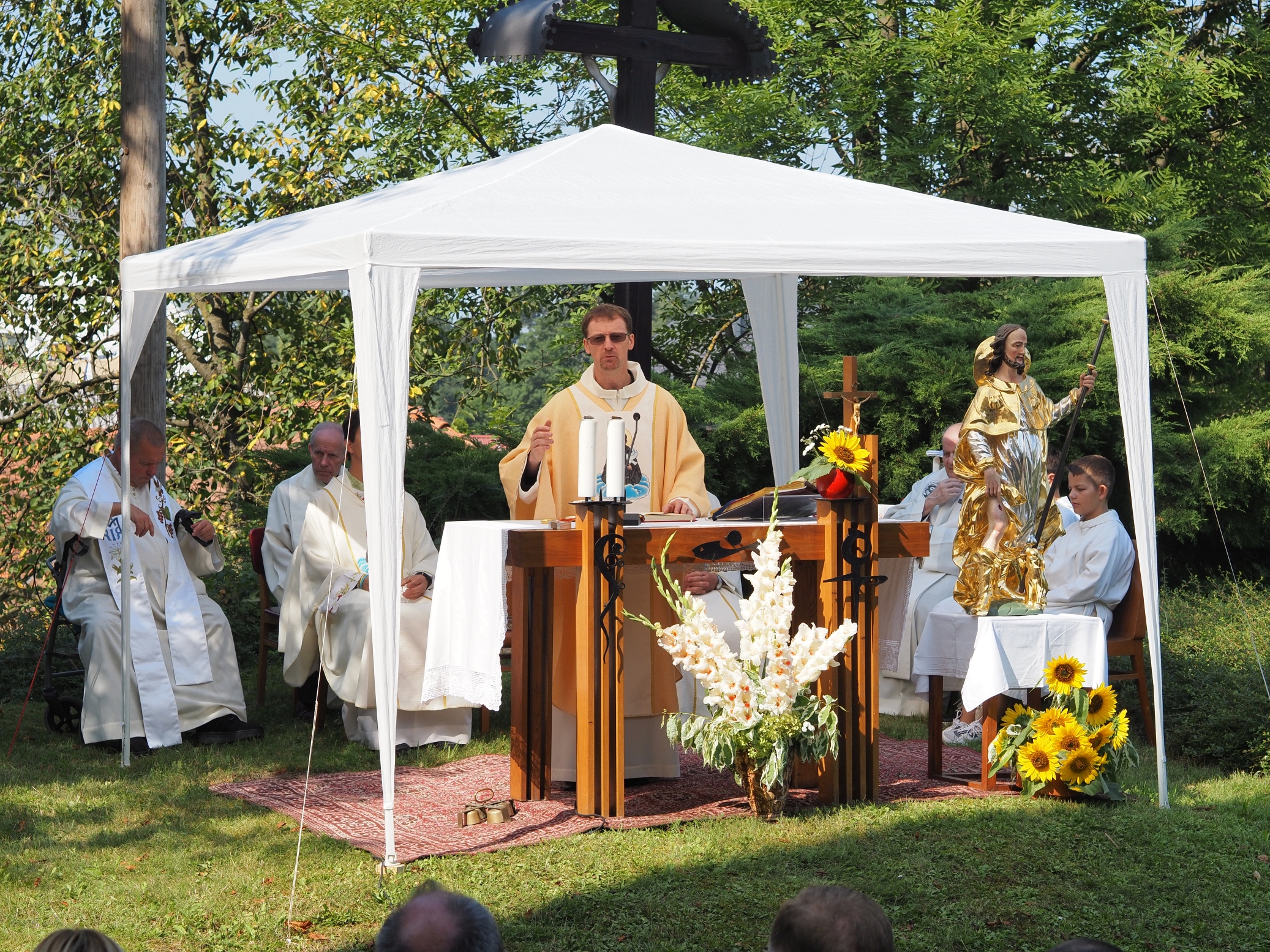 Pri sveti maši, ki smo jo obhajali zunaj pred cerkvijo nas je nagovoril p. Andrej Mohorčič, župnik sodelavec na Ptujski Gori, prepeval je župnijski pevski zbor pod glasbeno spremljavo Ane Glušič. Pozdravno pesem o svetem Roku so nam zapeli skupina hajdinski pod vodstvom Janka Kirbiš.